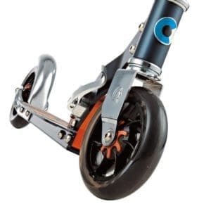 La ventaja de las ruedas anchas del patinete, como por ejemplo las del Micro Rocket, consiste en que estas ruedas están pensadas especialmente para las bajadas por cuestas empinadas. La amplia superficie de contacto asegura que el desgaste de la rueda con el frenado constante sea el mínimo posible. Una inserción de goma en la placa del freno lo protege del calentamiento rápido.